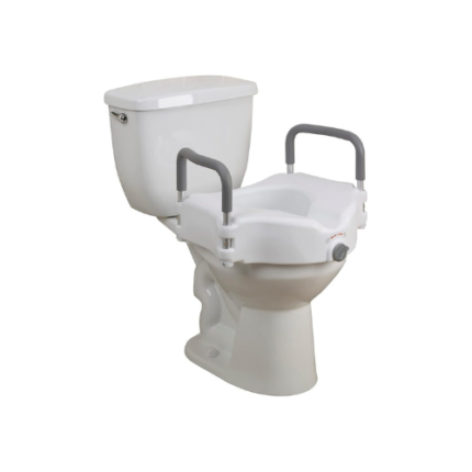 This elevated toilet seat by Drive Medical ensures you a safer and more secure fit than ever. The newly designed locking device is engineered to fit securely on almost any toilet. Heavy-duty molded plastic construction allows the product to remain lightweight without sacrificing strength and durability. It's comfortable padded arms are versatile, and can be removed without tools making transfer easy. The elevated seat and padded arms will help individuals who need a boost sitting down or standing up from the toilet.Features