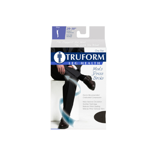 TRUFORM calf length dress-style support socks provide therapeutic, firm graduated compression to help restore leg health and reduce leg discomfort. Microfiber nylon is soft, and cooler to wear than standard nylon. Attractive rib-knit pattern makes this sock an excellent choice for business, or business-casual wear.