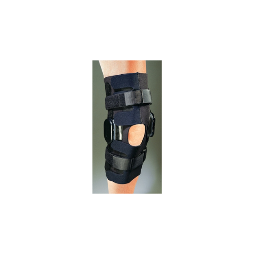 Available in black 1/8″ neoprene only. Front opening for easy on/off and custom fitting. Dual axis motion control hinges provide convenient dial-in adjustments with flexion/extension stops at 0°, 15°, 30°, 60° and 90°. Fully adjustable superior/inferior contact closure straps. Available in 13″ or 17″ length. Ideal for mild to moderate ACL/PCL sprains; osteoarthritis, collateral ligament sprains and strains.