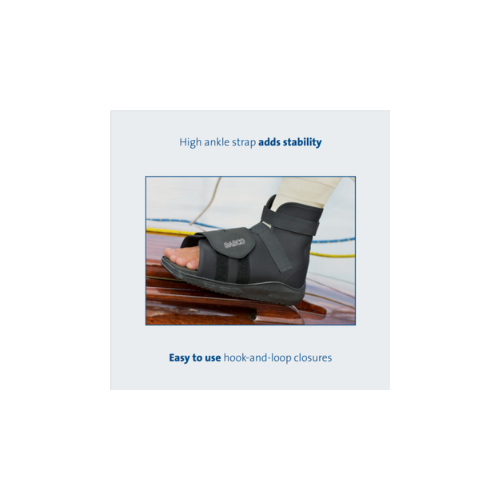 Rocker bottom with weatherproof, stretchable upper and contact closure. Ideal for lower leg casted fractures.