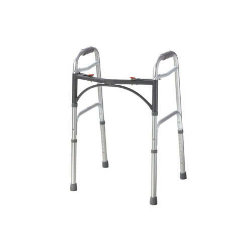 The Bariatric Aluminum Two Button Folding Walker by Drive Medical now comes in a wider and deeper frame designed to accommodate individuals up to 500 pounds. The precision design provides additional strength while adding minimal weight to the walker. The "U" brace, steel legs and side brace ensure security and stability.Features