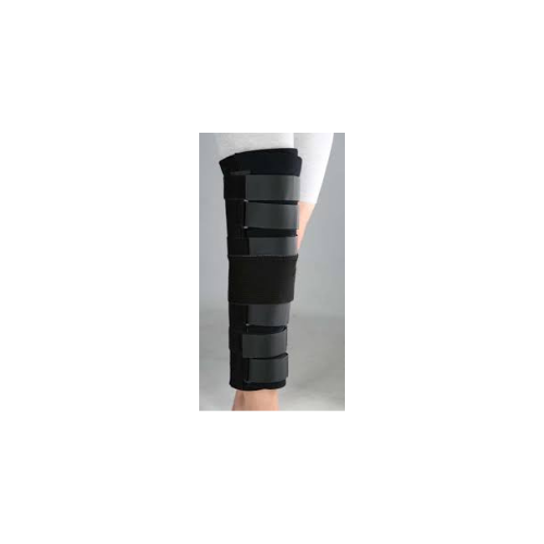 This immobilizer is constructed of all new, black, durable open-cell foam, which can be trimmed for a custom fit. The three posterior stays and moveable dual medial/lateral stays provide proper immobilization and positioning. Also comes with a 4″ elastic patella strap to lock out knee extension. Optional popliteal pad included. This immobilizer is ideal for post-operative immobilization; grade 1 and grade 2 collateral ligament sprain; patellar subluxations, and mild to severe knee injuries where full extension is required.