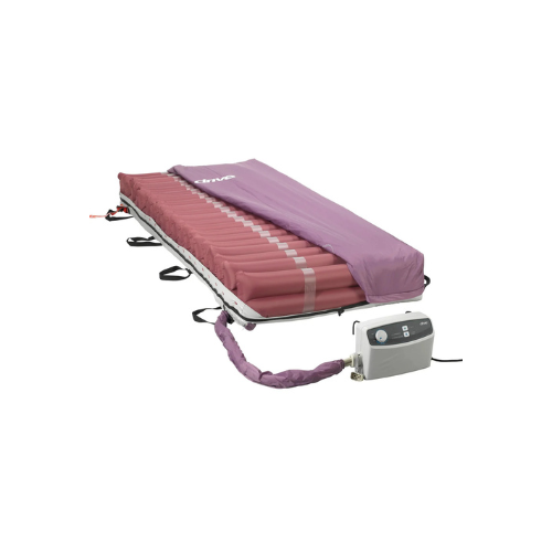 The Med Aire Alternating Pressure Mattress Replacement System with Low Air Loss by Drive Medical provides alternating pressure and is designed to be used in the prevention, treatment and management of Pressure Ulcers. The mattress has 20 air bladders, nine with laser holes to achieve the low air loss function and to increase patients comfort by keeping the affected area cool and dry ensuring a speedy recovery. The Aire cells are 8″ high and are constructed with 40% nylon/60% PVC for longevity and durability. The zippered mattress cover is constructed with a quilted, urethane coated, nylon fabric which is, water resistant, vapor permeable, machine washable and low sheer safeguarding the patients skin and comfort. The “Whisper Quiet” pump produces a consistent air flow and the special vibration isolating features insure that the patient rests easily. The LED and audible alarms provide critical performance date and alert a caregiver when the pressure falls below 10mmHG, guaranteeing the patient is always comfortable.