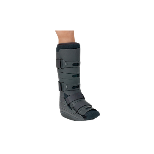 Lightweight, durable, one-piece wrap-around shell, provides maximum immobilization and support following ligament and tendon repair, osteotomy, pinning procedures, stress fractures or post-operative bunion surgery. Unique design of circumferential shell also accommodates larger calf sizes. Low profile, cushioned rocker sole absorbs impact of heel strike to improve comfort during ambulation. Washable nylon foam liner with removable toe cover.