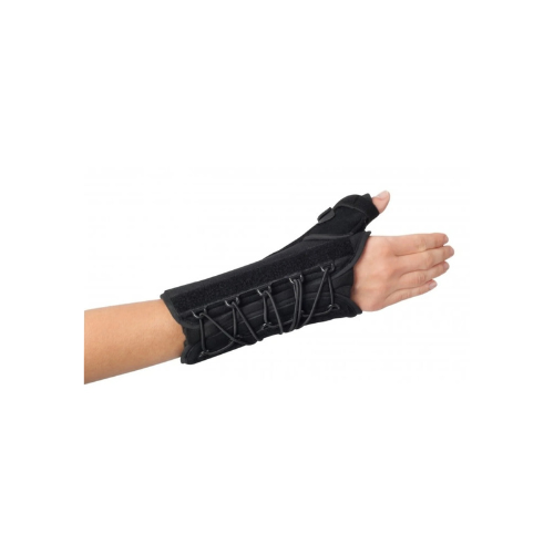 Comfortable, lightweight nylon/foam laminate with adjustable dorsal pod to accommodate various size patients. Pre-contoured aluminum palmar and thumb stays may be adjusted for proper angulation to address wrist and thumb pathologies. Elastic straps with D-ring closure provide compressive support and maximum patient comfort. Universal size, available in right or left. Ideal for addressing deQuervain’s Syndrome, Gamekeeper’s thumb, scaphoid injuries, sprains and strains.