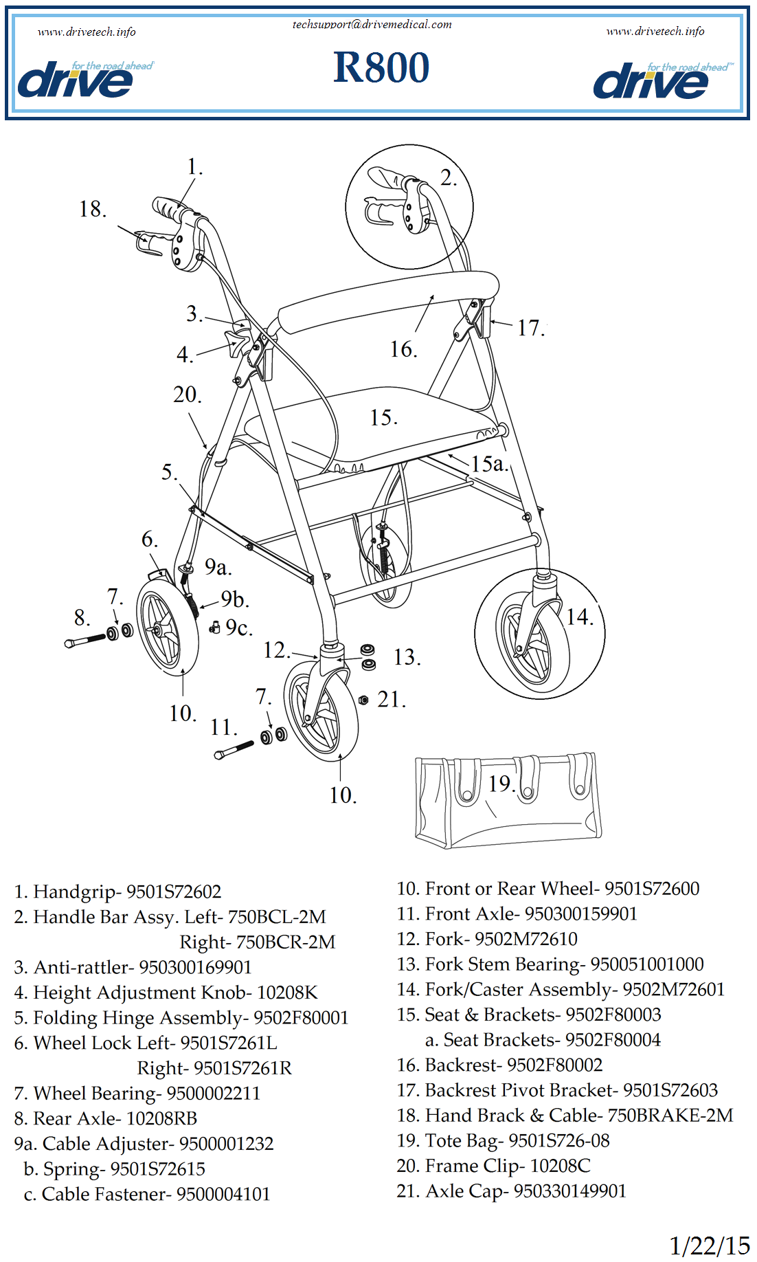 - Handsome and removable zippered storage bag. Unique bag attachment keeps bag securely in place when rollator is open or folded. (Figure F)