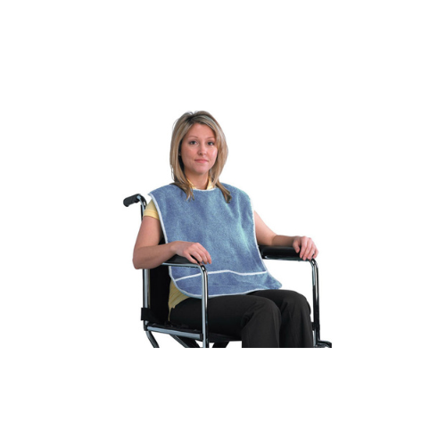 - Terry cloth bib with bias binding and adjustable hook and loop fastener closure