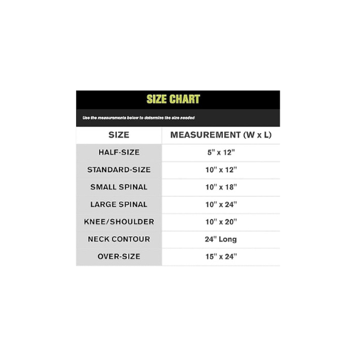 | 1012 | Knee/Shoulder | 10″ x 20″ (25 x 50 cm) |
