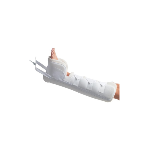 Two piece body is constructed of an inner liner with open-cell convoluted foam and foam laminate outer casing. Inner foam liner may be replaced for patient hygiene as needed. Universal sizing reduces stocking inventory. Three elastic lower leg straps secure with a contact closure to either side of outer casing and can be adjusted for patient comfort. Adjustable elastic foot strap helps to impede foot drop. Removable aluminum medial/lateral stays. 6″ spreader bar is incorporated into design. Ideal for hip and/or femur fractures.
